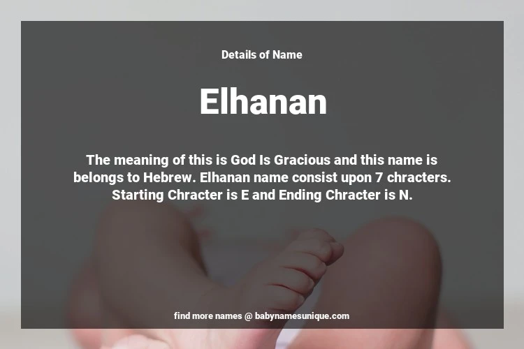 The name Elhanan is chosen by those who are willing to find Unique Boy Baby Names. The meaning of this is God Is Gracious and this name is belongs to Hebrew Origin. Baby Name Elhanan consist upon 7 chracters. Starting alphabet is E and ending alphabet is N. This name is used primarily by parents who are considering unique baby names for Boy. The Zodiac Sign suitbale for this name are;
