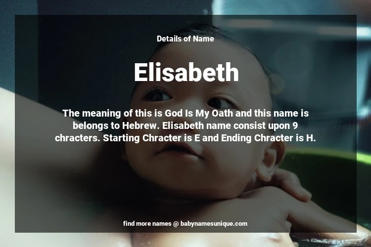 The name Elisabeth is chosen by those who are willing to find Unique Transgenders Baby Names. The meaning of this is God Is My Oath and this name is belongs to Hebrew Origin. Baby Name Elisabeth consist upon 9 chracters. Starting alphabet is E and ending alphabet is H. This name is used primarily by parents who are considering unique baby names for Transgenders. The Zodiac Sign suitbale for this name are;