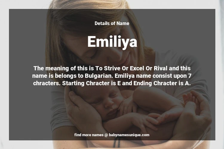 The name Emiliya is chosen by those who are willing to find Unique Transgenders Baby Names. The meaning of this is To Strive Or Excel Or Rival and this name is belongs to Bulgarian Origin. Baby Name Emiliya consist upon 7 chracters. Starting alphabet is E and ending alphabet is A. This name is used primarily by parents who are considering unique baby names for Transgenders. The Zodiac Sign suitbale for this name are;