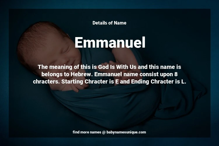 The name Emmanuel is chosen by those who are willing to find Unique Boy Baby Names. The meaning of this is God Is With Us and this name is belongs to Hebrew Origin. Baby Name Emmanuel consist upon 8 chracters. Starting alphabet is E and ending alphabet is L. This name is used primarily by parents who are considering unique baby names for Boy. The Zodiac Sign suitbale for this name are;