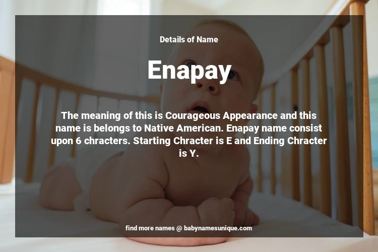 The name Enapay is chosen by those who are willing to find Unique Boy Baby Names. The meaning of this is Courageous Appearance and this name is belongs to Native American Origin. Baby Name Enapay consist upon 6 chracters. Starting alphabet is E and ending alphabet is Y. This name is used primarily by parents who are considering unique baby names for Boy. The Zodiac Sign suitbale for this name are;