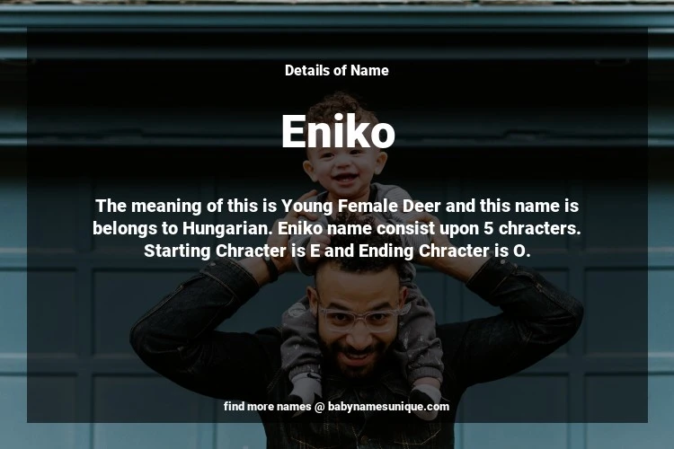 The name Eniko is chosen by those who are willing to find Unique Transgenders Baby Names. The meaning of this is Young Female Deer and this name is belongs to Hungarian Origin. Baby Name Eniko consist upon 5 chracters. Starting alphabet is E and ending alphabet is O. This name is used primarily by parents who are considering unique baby names for Transgenders. The Zodiac Sign suitbale for this name are;