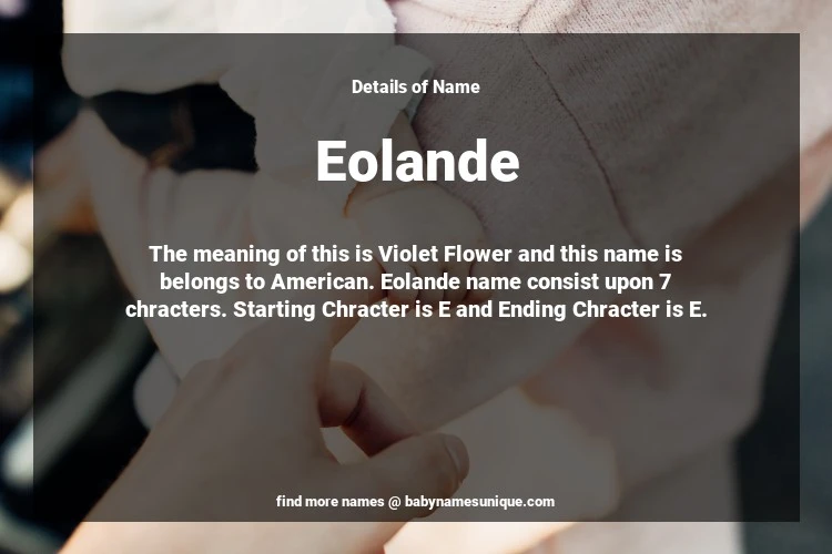 The name Eolande is chosen by those who are willing to find Unique Transgenders Baby Names. The meaning of this is Violet Flower and this name is belongs to American Origin. Baby Name Eolande consist upon 7 chracters. Starting alphabet is E and ending alphabet is E. This name is used primarily by parents who are considering unique baby names for Transgenders. The Zodiac Sign suitbale for this name are;