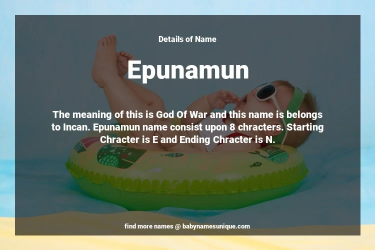 The name Epunamun is chosen by those who are willing to find Unique Boy Baby Names. The meaning of this is God Of War and this name is belongs to Incan Origin. Baby Name Epunamun consist upon 8 chracters. Starting alphabet is E and ending alphabet is N. This name is used primarily by parents who are considering unique baby names for Boy. The Zodiac Sign suitbale for this name are;