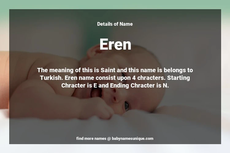The name Eren is chosen by those who are willing to find Unique Boy Baby Names. The meaning of this is Saint and this name is belongs to Turkish Origin. Baby Name Eren consist upon 4 chracters. Starting alphabet is E and ending alphabet is N. This name is used primarily by parents who are considering unique baby names for Boy. The Zodiac Sign suitbale for this name are;