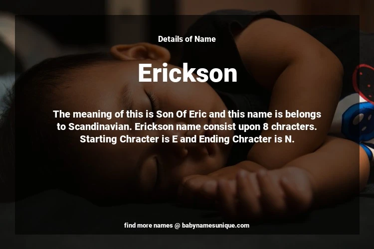 The name Erickson is chosen by those who are willing to find Unique Transgenders Baby Names. The meaning of this is Son Of Eric and this name is belongs to Scandinavian Origin. Baby Name Erickson consist upon 8 chracters. Starting alphabet is E and ending alphabet is N. This name is used primarily by parents who are considering unique baby names for Transgenders. The Zodiac Sign suitbale for this name are;