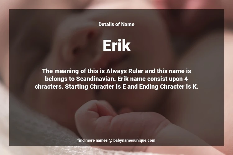 The name Erik is chosen by those who are willing to find Unique Boy Baby Names. The meaning of this is Always Ruler and this name is belongs to Scandinavian Origin. Baby Name Erik consist upon 4 chracters. Starting alphabet is E and ending alphabet is K. This name is used primarily by parents who are considering unique baby names for Boy. The Zodiac Sign suitbale for this name are;