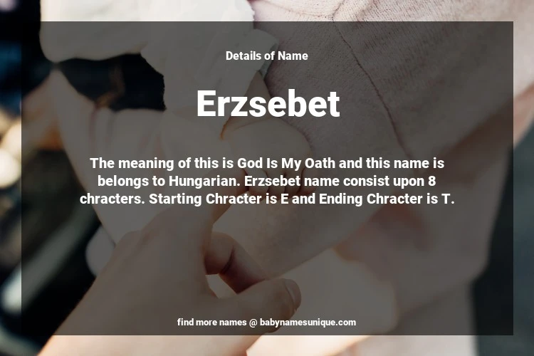 The name Erzsebet is chosen by those who are willing to find Unique Transgenders Baby Names. The meaning of this is God Is My Oath and this name is belongs to Hungarian Origin. Baby Name Erzsebet consist upon 8 chracters. Starting alphabet is E and ending alphabet is T. This name is used primarily by parents who are considering unique baby names for Transgenders. The Zodiac Sign suitbale for this name are;