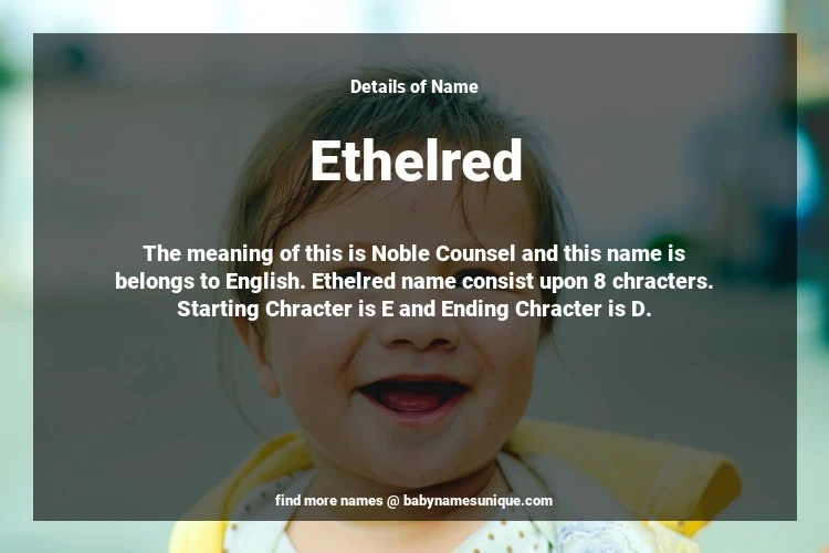 The name Ethelred is chosen by those who are willing to find Unique Transgenders Baby Names. The meaning of this is Noble Counsel and this name is belongs to English Origin. Baby Name Ethelred consist upon 8 chracters. Starting alphabet is E and ending alphabet is D. This name is used primarily by parents who are considering unique baby names for Transgenders. The Zodiac Sign suitbale for this name are;