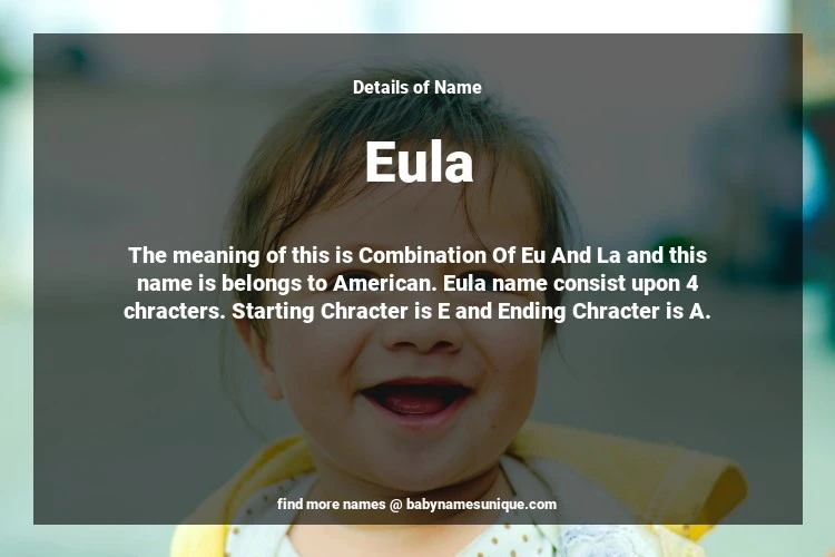 The name Eula is chosen by those who are willing to find Unique Transgenders Baby Names. The meaning of this is Combination Of Eu And La and this name is belongs to American Origin. Baby Name Eula consist upon 4 chracters. Starting alphabet is E and ending alphabet is A. This name is used primarily by parents who are considering unique baby names for Transgenders. The Zodiac Sign suitbale for this name are;