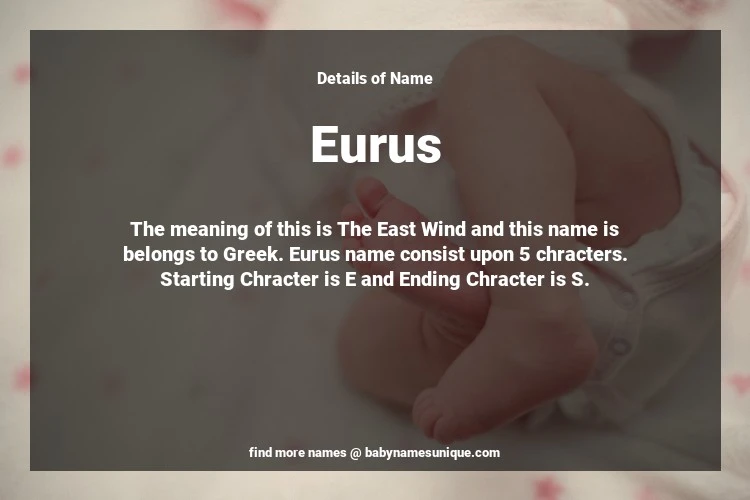 The name Eurus is chosen by those who are willing to find Unique Transgenders Baby Names. The meaning of this is The East Wind and this name is belongs to Greek Origin. Baby Name Eurus consist upon 5 chracters. Starting alphabet is E and ending alphabet is S. This name is used primarily by parents who are considering unique baby names for Transgenders. The Zodiac Sign suitbale for this name are;