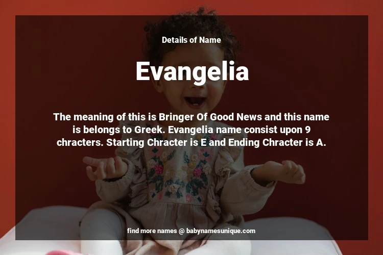 The name Evangelia is chosen by those who are willing to find Unique Transgenders Baby Names. The meaning of this is Bringer Of Good News and this name is belongs to Greek Origin. Baby Name Evangelia consist upon 9 chracters. Starting alphabet is E and ending alphabet is A. This name is used primarily by parents who are considering unique baby names for Transgenders. The Zodiac Sign suitbale for this name are;