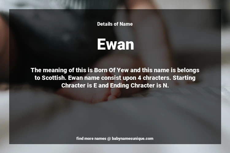 The name Ewan is chosen by those who are willing to find Unique Boy Baby Names. The meaning of this is Born Of Yew and this name is belongs to Scottish Origin. Baby Name Ewan consist upon 4 chracters. Starting alphabet is E and ending alphabet is N. This name is used primarily by parents who are considering unique baby names for Boy. The Zodiac Sign suitbale for this name are;