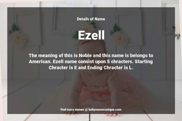 The name Ezell is chosen by those who are willing to find Unique Boy Baby Names. The meaning of this is Noble and this name is belongs to American Origin. Baby Name Ezell consist upon 5 chracters. Starting alphabet is E and ending alphabet is L. This name is used primarily by parents who are considering unique baby names for Boy. The Zodiac Sign suitbale for this name are;
