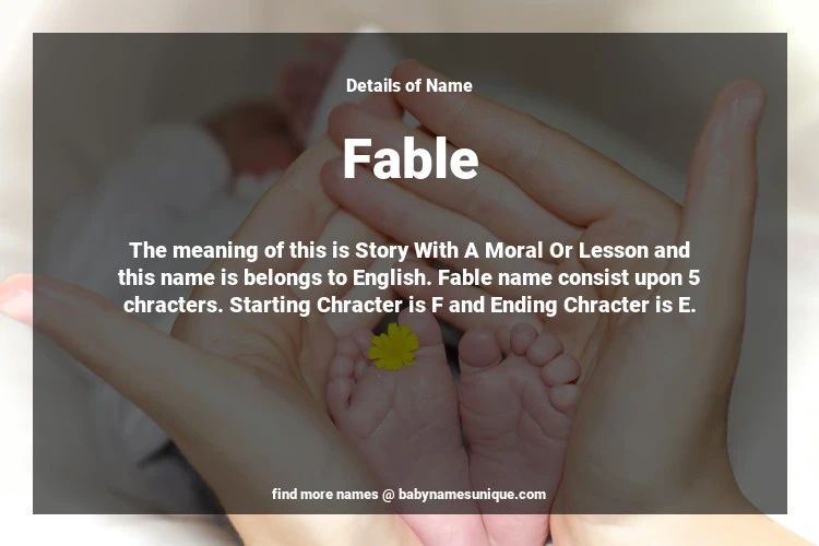 The name Fable is chosen by those who are willing to find Unique Transgenders Baby Names. The meaning of this is Story With A Moral Or Lesson and this name is belongs to English Origin. Baby Name Fable consist upon 5 chracters. Starting alphabet is F and ending alphabet is E. This name is used primarily by parents who are considering unique baby names for Transgenders. The Zodiac Sign suitbale for this name are;