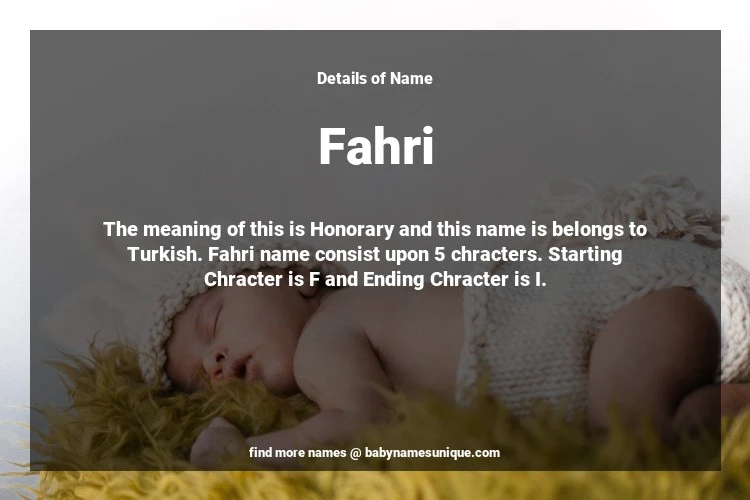 The name Fahri is chosen by those who are willing to find Unique Boy Baby Names. The meaning of this is Honorary and this name is belongs to Turkish Origin. Baby Name Fahri consist upon 5 chracters. Starting alphabet is F and ending alphabet is I. This name is used primarily by parents who are considering unique baby names for Boy. The Zodiac Sign suitbale for this name are;