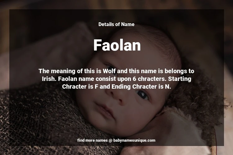 The name Faolan is chosen by those who are willing to find Unique Boy Baby Names. The meaning of this is Wolf and this name is belongs to Irish Origin. Baby Name Faolan consist upon 6 chracters. Starting alphabet is F and ending alphabet is N. This name is used primarily by parents who are considering unique baby names for Boy. The Zodiac Sign suitbale for this name are;
