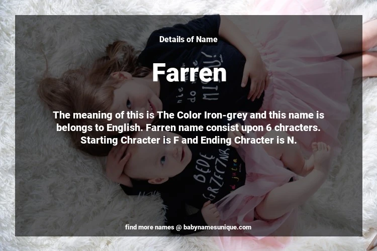 The name Farren is chosen by those who are willing to find Unique Transgenders Baby Names. The meaning of this is The Color Iron-grey and this name is belongs to English Origin. Baby Name Farren consist upon 6 chracters. Starting alphabet is F and ending alphabet is N. This name is used primarily by parents who are considering unique baby names for Transgenders. The Zodiac Sign suitbale for this name are;