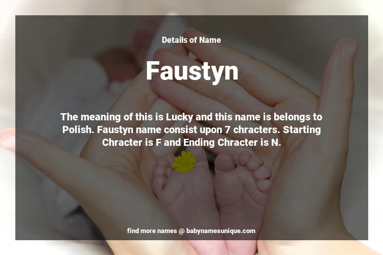 The name Faustyn is chosen by those who are willing to find Unique Boy Baby Names. The meaning of this is Lucky and this name is belongs to Polish Origin. Baby Name Faustyn consist upon 7 chracters. Starting alphabet is F and ending alphabet is N. This name is used primarily by parents who are considering unique baby names for Boy. The Zodiac Sign suitbale for this name are;