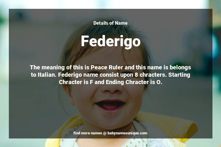 The name Federigo is chosen by those who are willing to find Unique Boy Baby Names. The meaning of this is Peace Ruler and this name is belongs to Italian Origin. Baby Name Federigo consist upon 8 chracters. Starting alphabet is F and ending alphabet is O. This name is used primarily by parents who are considering unique baby names for Boy. The Zodiac Sign suitbale for this name are;