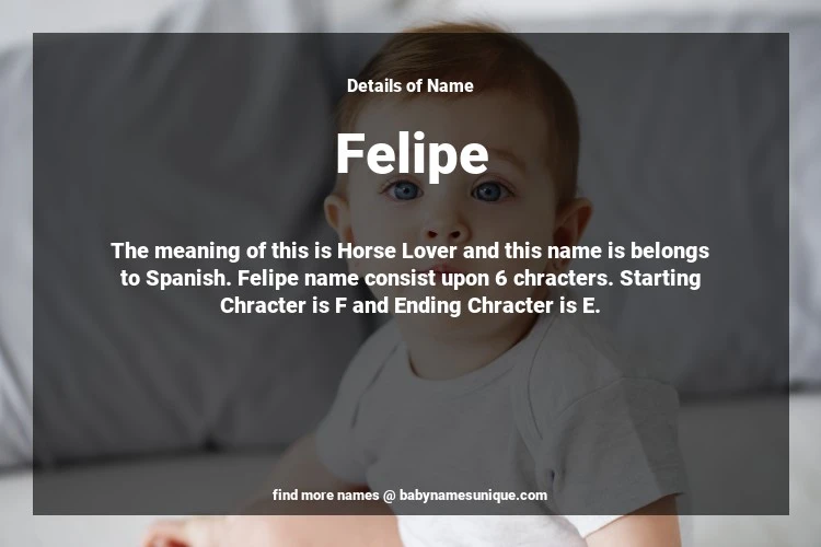 The name Felipe is chosen by those who are willing to find Unique Boy Baby Names. The meaning of this is Horse Lover and this name is belongs to Spanish Origin. Baby Name Felipe consist upon 6 chracters. Starting alphabet is F and ending alphabet is E. This name is used primarily by parents who are considering unique baby names for Boy. The Zodiac Sign suitbale for this name are;