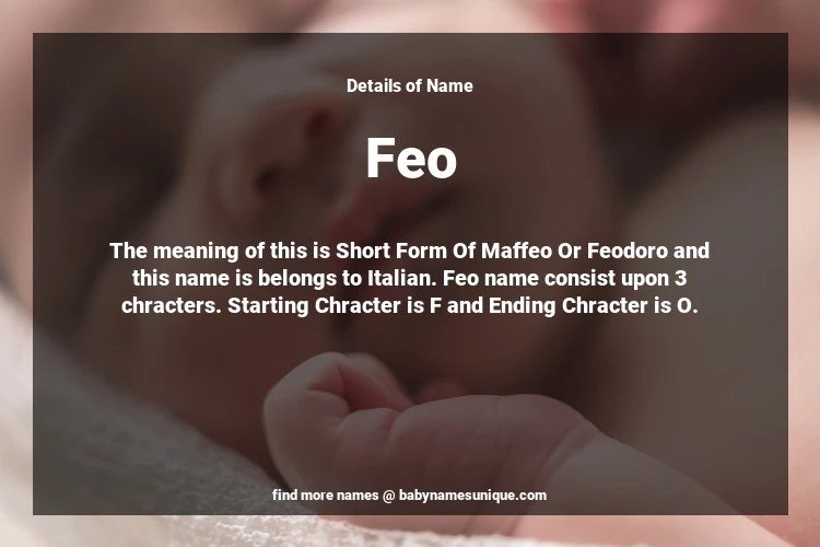 The name Feo is chosen by those who are willing to find Unique Boy Baby Names. The meaning of this is Short Form Of Maffeo Or Feodoro and this name is belongs to Italian Origin. Baby Name Feo consist upon 3 chracters. Starting alphabet is F and ending alphabet is O. This name is used primarily by parents who are considering unique baby names for Boy. The Zodiac Sign suitbale for this name are;