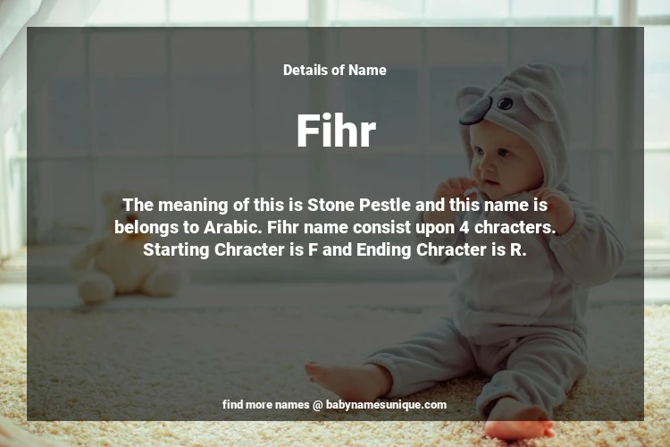 The name Fihr is chosen by those who are willing to find Unique Boy Baby Names. The meaning of this is Stone Pestle and this name is belongs to Arabic Origin. Baby Name Fihr consist upon 4 chracters. Starting alphabet is F and ending alphabet is R. This name is used primarily by parents who are considering unique baby names for Boy. The Zodiac Sign suitbale for this name are;