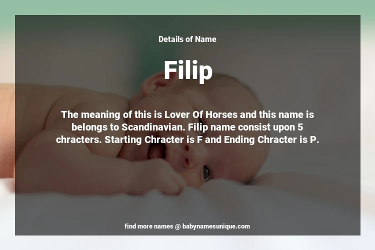 The name Filip is chosen by those who are willing to find Unique Boy Baby Names. The meaning of this is Lover Of Horses and this name is belongs to Scandinavian Origin. Baby Name Filip consist upon 5 chracters. Starting alphabet is F and ending alphabet is P. This name is used primarily by parents who are considering unique baby names for Boy. The Zodiac Sign suitbale for this name are;