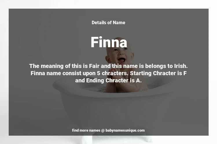 The name Finna is chosen by those who are willing to find Unique Transgenders Baby Names. The meaning of this is Fair and this name is belongs to Irish Origin. Baby Name Finna consist upon 5 chracters. Starting alphabet is F and ending alphabet is A. This name is used primarily by parents who are considering unique baby names for Transgenders. The Zodiac Sign suitbale for this name are;