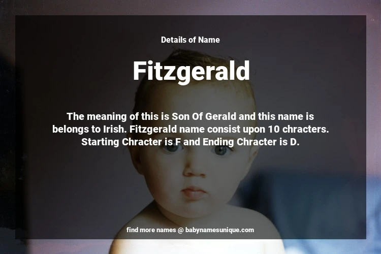 The name Fitzgerald is chosen by those who are willing to find Unique Boy Baby Names. The meaning of this is Son Of Gerald and this name is belongs to Irish Origin. Baby Name Fitzgerald consist upon 10 chracters. Starting alphabet is F and ending alphabet is D. This name is used primarily by parents who are considering unique baby names for Boy. The Zodiac Sign suitbale for this name are;