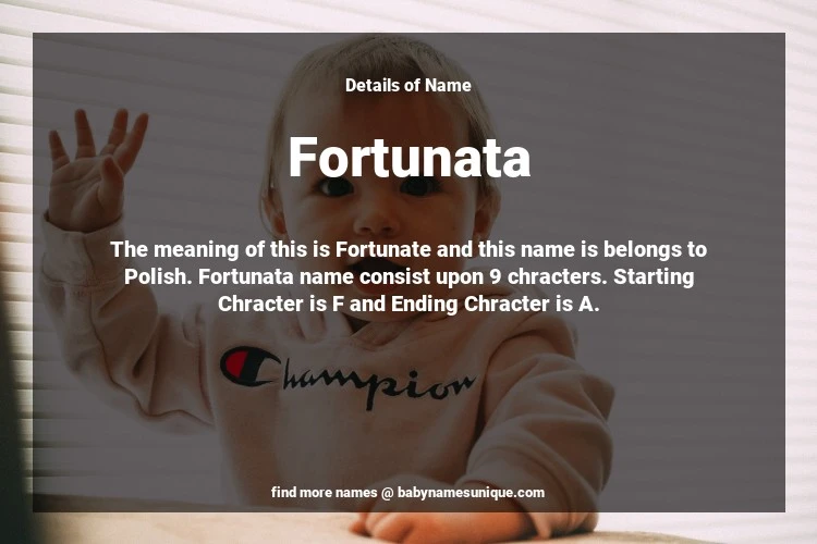 The name Fortunata is chosen by those who are willing to find Unique Transgenders Baby Names. The meaning of this is Fortunate and this name is belongs to Polish Origin. Baby Name Fortunata consist upon 9 chracters. Starting alphabet is F and ending alphabet is A. This name is used primarily by parents who are considering unique baby names for Transgenders. The Zodiac Sign suitbale for this name are;
