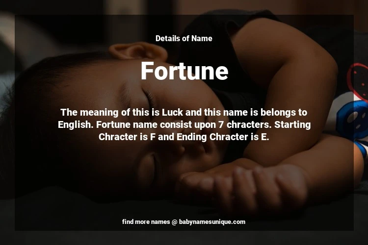 The name Fortune is chosen by those who are willing to find Unique Boy Baby Names. The meaning of this is Luck and this name is belongs to English Origin. Baby Name Fortune consist upon 7 chracters. Starting alphabet is F and ending alphabet is E. This name is used primarily by parents who are considering unique baby names for Boy. The Zodiac Sign suitbale for this name are;