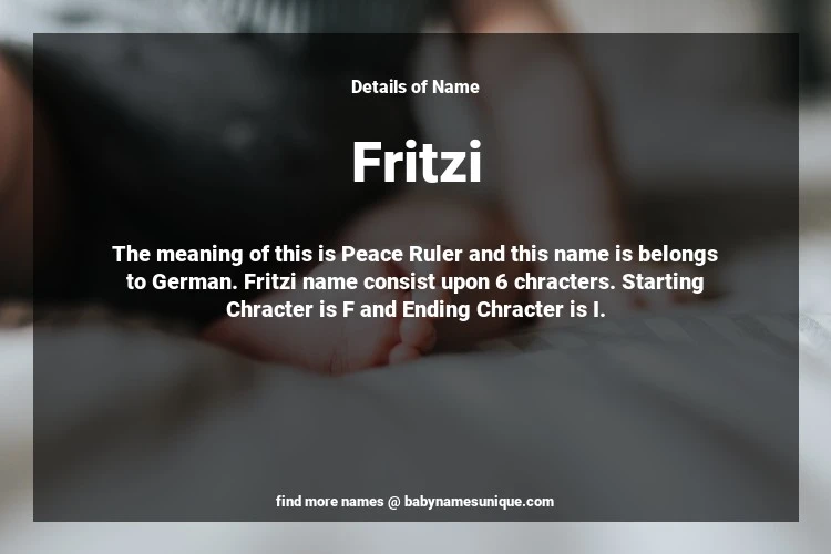 The name Fritzi is chosen by those who are willing to find Unique Transgenders Baby Names. The meaning of this is Peace Ruler and this name is belongs to German Origin. Baby Name Fritzi consist upon 6 chracters. Starting alphabet is F and ending alphabet is I. This name is used primarily by parents who are considering unique baby names for Transgenders. The Zodiac Sign suitbale for this name are;