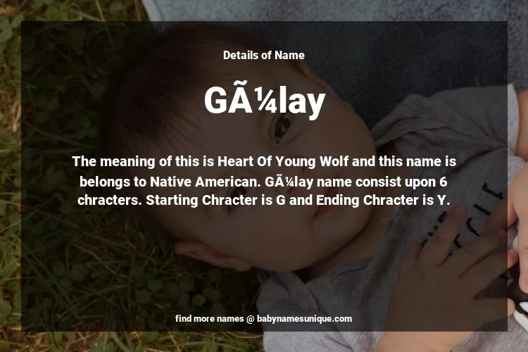 The name Gülay is chosen by those who are willing to find Unique Transgenders Baby Names. The meaning of this is Heart Of Young Wolf and this name is belongs to Native American Origin. Baby Name Gülay consist upon 6 chracters. Starting alphabet is G and ending alphabet is Y. This name is used primarily by parents who are considering unique baby names for Transgenders. The Zodiac Sign suitbale for this name are;