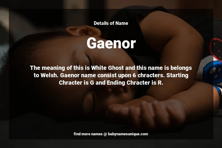 The name Gaenor is chosen by those who are willing to find Unique Transgenders Baby Names. The meaning of this is White Ghost and this name is belongs to Welsh Origin. Baby Name Gaenor consist upon 6 chracters. Starting alphabet is G and ending alphabet is R. This name is used primarily by parents who are considering unique baby names for Transgenders. The Zodiac Sign suitbale for this name are;