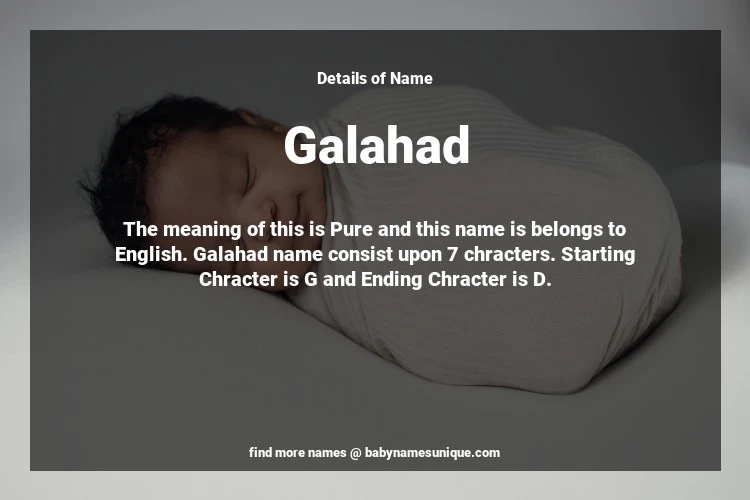 The name Galahad is chosen by those who are willing to find Unique Boy Baby Names. The meaning of this is Pure and this name is belongs to English Origin. Baby Name Galahad consist upon 7 chracters. Starting alphabet is G and ending alphabet is D. This name is used primarily by parents who are considering unique baby names for Boy. The Zodiac Sign suitbale for this name are;