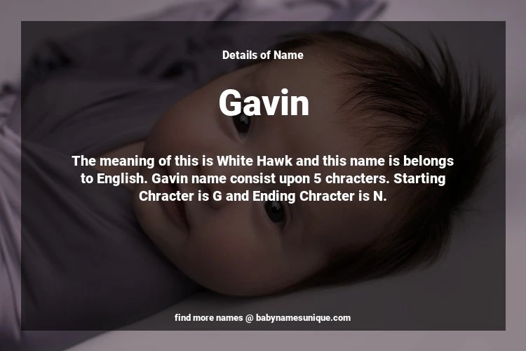 The name Gavin is chosen by those who are willing to find Unique Boy Baby Names. The meaning of this is White Hawk and this name is belongs to English Origin. Baby Name Gavin consist upon 5 chracters. Starting alphabet is G and ending alphabet is N. This name is used primarily by parents who are considering unique baby names for Boy. The Zodiac Sign suitbale for this name are;