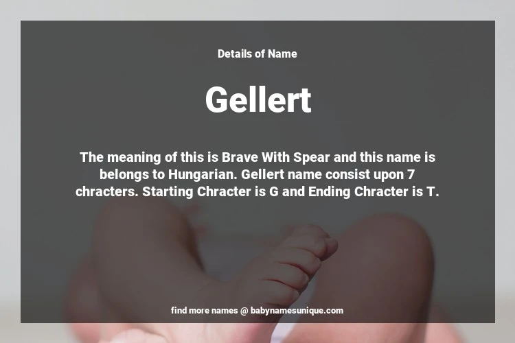 The name Gellert is chosen by those who are willing to find Unique Boy Baby Names. The meaning of this is Brave With Spear and this name is belongs to Hungarian Origin. Baby Name Gellert consist upon 7 chracters. Starting alphabet is G and ending alphabet is T. This name is used primarily by parents who are considering unique baby names for Boy. The Zodiac Sign suitbale for this name are;