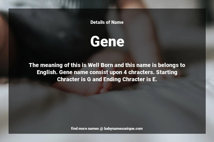 The name Gene is chosen by those who are willing to find Unique Transgenders Baby Names. The meaning of this is Well Born and this name is belongs to English Origin. Baby Name Gene consist upon 4 chracters. Starting alphabet is G and ending alphabet is E. This name is used primarily by parents who are considering unique baby names for Transgenders. The Zodiac Sign suitbale for this name are;