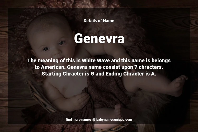 The name Genevra is chosen by those who are willing to find Unique Transgenders Baby Names. The meaning of this is White Wave and this name is belongs to American Origin. Baby Name Genevra consist upon 7 chracters. Starting alphabet is G and ending alphabet is A. This name is used primarily by parents who are considering unique baby names for Transgenders. The Zodiac Sign suitbale for this name are;