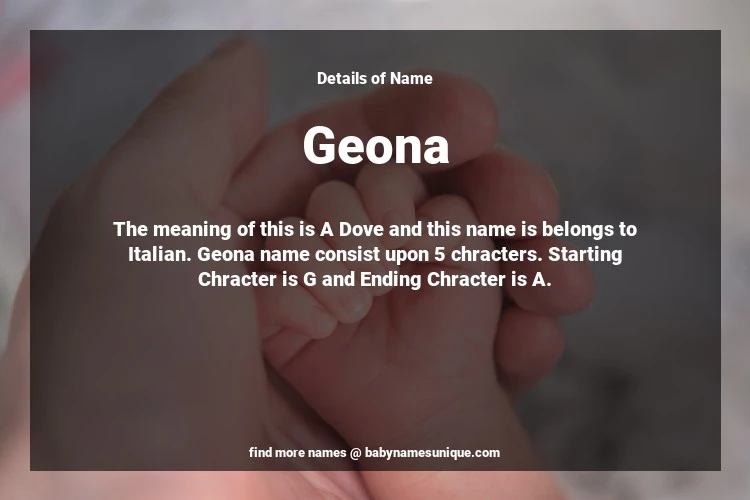 The name Geona is chosen by those who are willing to find Unique Boy Baby Names. The meaning of this is A Dove and this name is belongs to Italian Origin. Baby Name Geona consist upon 5 chracters. Starting alphabet is G and ending alphabet is A. This name is used primarily by parents who are considering unique baby names for Boy. The Zodiac Sign suitbale for this name are;