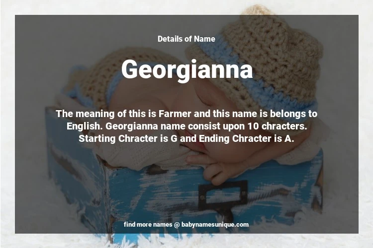 The name Georgianna is chosen by those who are willing to find Unique Transgenders Baby Names. The meaning of this is Farmer and this name is belongs to English Origin. Baby Name Georgianna consist upon 10 chracters. Starting alphabet is G and ending alphabet is A. This name is used primarily by parents who are considering unique baby names for Transgenders. The Zodiac Sign suitbale for this name are;