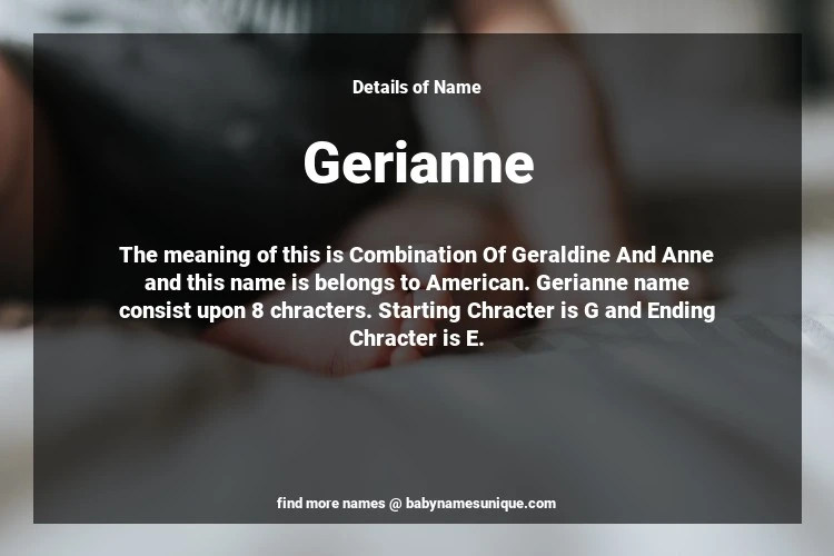The name Gerianne is chosen by those who are willing to find Unique Transgenders Baby Names. The meaning of this is Combination Of Geraldine And Anne and this name is belongs to American Origin. Baby Name Gerianne consist upon 8 chracters. Starting alphabet is G and ending alphabet is E. This name is used primarily by parents who are considering unique baby names for Transgenders. The Zodiac Sign suitbale for this name are;