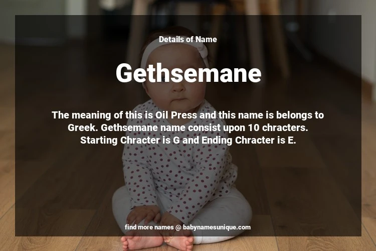 The name Gethsemane is chosen by those who are willing to find Unique Transgenders Baby Names. The meaning of this is Oil Press and this name is belongs to Greek Origin. Baby Name Gethsemane consist upon 10 chracters. Starting alphabet is G and ending alphabet is E. This name is used primarily by parents who are considering unique baby names for Transgenders. The Zodiac Sign suitbale for this name are;