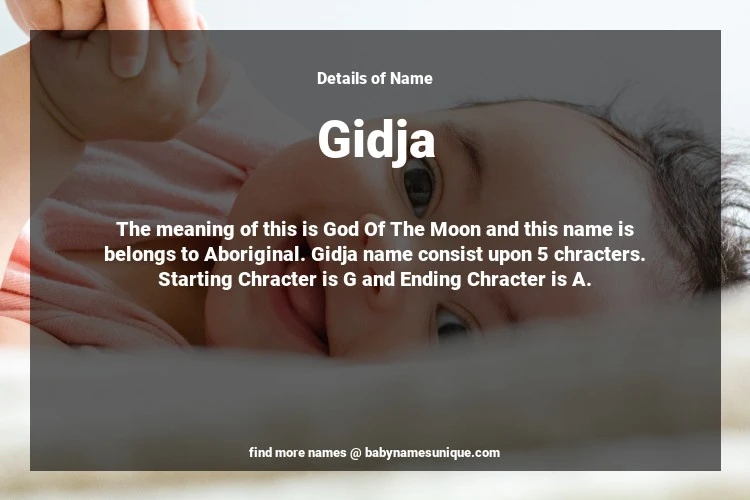 The name Gidja is chosen by those who are willing to find Unique Transgenders Baby Names. The meaning of this is God Of The Moon and this name is belongs to Aboriginal Origin. Baby Name Gidja consist upon 5 chracters. Starting alphabet is G and ending alphabet is A. This name is used primarily by parents who are considering unique baby names for Transgenders. The Zodiac Sign suitbale for this name are;