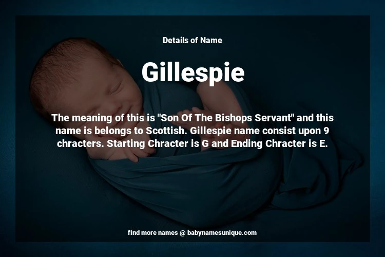 The name Gillespie is chosen by those who are willing to find Unique Boy Baby Names. The meaning of this is "Son Of The Bishops Servant" and this name is belongs to Scottish Origin. Baby Name Gillespie consist upon 9 chracters. Starting alphabet is G and ending alphabet is E. This name is used primarily by parents who are considering unique baby names for Boy. The Zodiac Sign suitbale for this name are;
