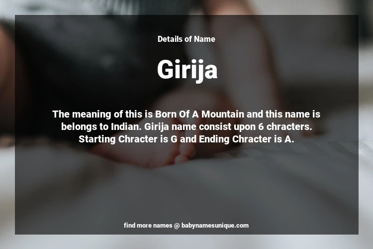 The name Girija is chosen by those who are willing to find Unique Transgenders Baby Names. The meaning of this is Born Of A Mountain and this name is belongs to Indian Origin. Baby Name Girija consist upon 6 chracters. Starting alphabet is G and ending alphabet is A. This name is used primarily by parents who are considering unique baby names for Transgenders. The Zodiac Sign suitbale for this name are;