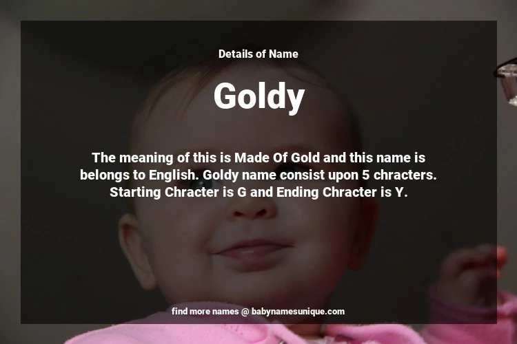 The name Goldy is chosen by those who are willing to find Unique Transgenders Baby Names. The meaning of this is Made Of Gold and this name is belongs to English Origin. Baby Name Goldy consist upon 5 chracters. Starting alphabet is G and ending alphabet is Y. This name is used primarily by parents who are considering unique baby names for Transgenders. The Zodiac Sign suitbale for this name are;