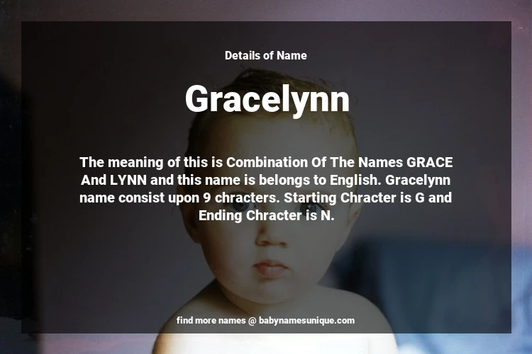 The name Gracelynn is chosen by those who are willing to find Unique Transgenders Baby Names. The meaning of this is Combination Of The Names GRACE And LYNN and this name is belongs to English Origin. Baby Name Gracelynn consist upon 9 chracters. Starting alphabet is G and ending alphabet is N. This name is used primarily by parents who are considering unique baby names for Transgenders. The Zodiac Sign suitbale for this name are;
