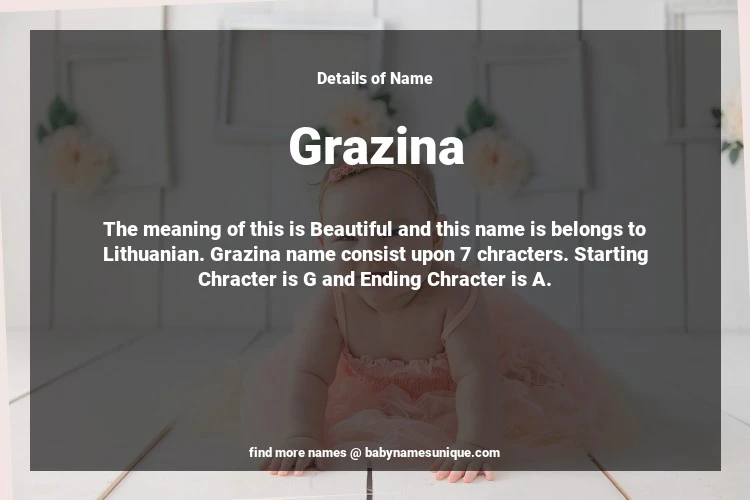 The name Grazina is chosen by those who are willing to find Unique Transgenders Baby Names. The meaning of this is Beautiful and this name is belongs to Lithuanian Origin. Baby Name Grazina consist upon 7 chracters. Starting alphabet is G and ending alphabet is A. This name is used primarily by parents who are considering unique baby names for Transgenders. The Zodiac Sign suitbale for this name are;